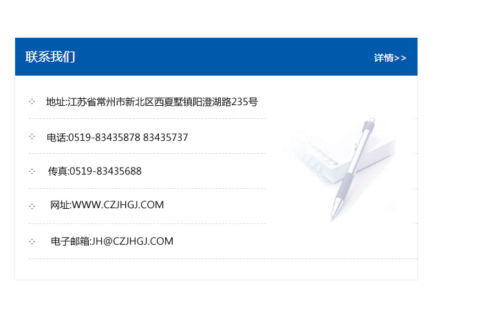 地址:常州市新北區友邦商務大廈1幢16、17層  電話:0519-85101652  傳真:0519-85112595  郵編:213022  網址:www_cz-jiayue_cn.zhixincai.com  郵箱:xiajifengaa@163.com